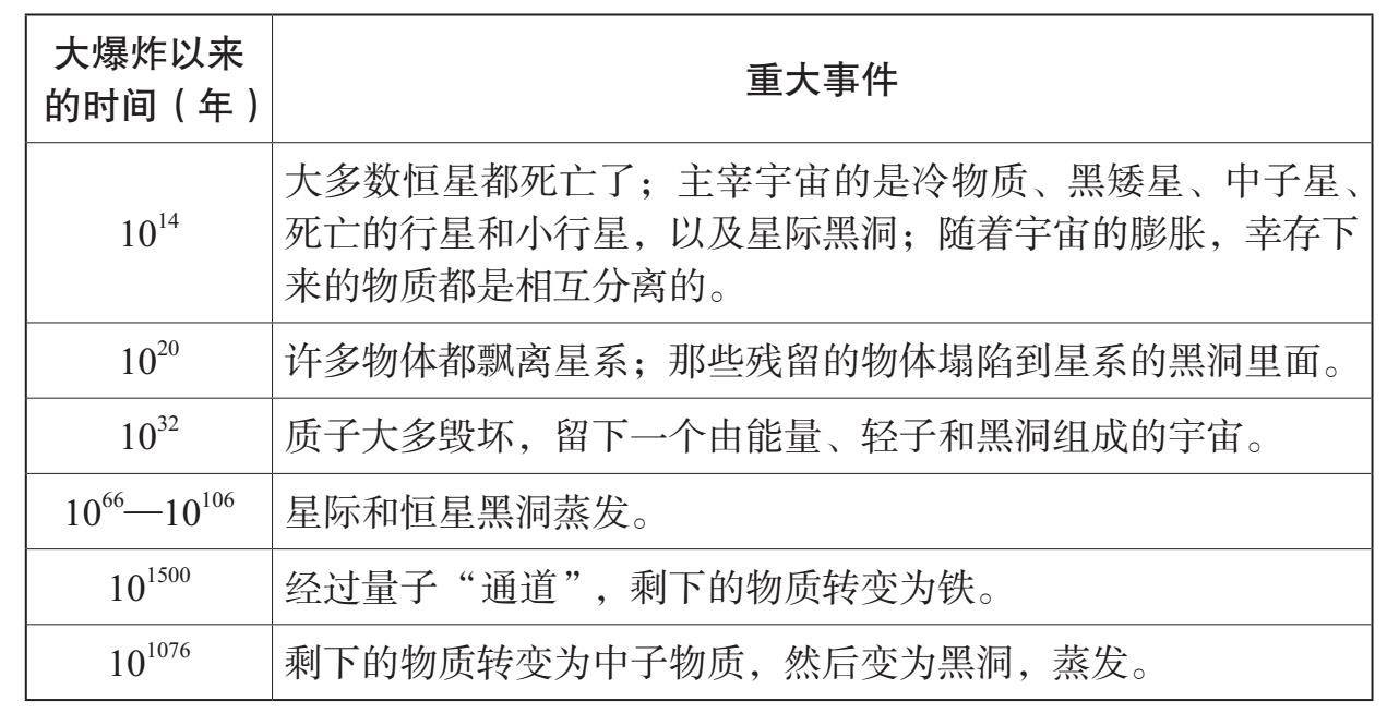 但是斯蒂芬·霍金在20世纪70年代证明,甚至黑洞也会丧失能量,在经过无数难以想象的时期之后消失。它们因量子蒸发而导致的死亡将持续一段时期,比所有以前经历时间还要长10多亿倍,与这段漫长时期相比,10亿年相当于海滩上的一粒沙子(参见表15.1)。普兰佐斯认为,按照这个比例,黑洞开始统治宇宙之前的1030年,“看上去甚至比今天我们看普朗克时间还要短!”[24]黑洞背后还会留下一些什么吗?绝无仅有:保罗·戴维想象那是“一盘难以设想的稀汤,由数量逐渐减少的光子、核子以及电子和正电子组成,它们逐渐地、缓慢地远离对方。就我们所知,再也不会发生更进一步的物理过程了。没有任何重大事件打扰这个宇宙的凄惨贫瘠,这个宇宙气数已尽,终将直面永生的宇宙——也许永死是一个比较确切的描述。”[25]