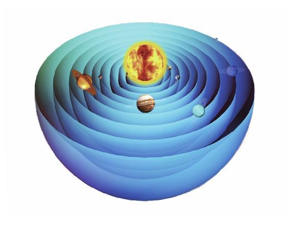 一直到公元1543年,地心说的统治地位才发生动摇。那一年,波兰天文学家哥白尼出版了著名的《天体运行论》,书中提出了一个新的宇宙学模型,也就是我们今天熟悉的日心说。下图描绘了日心说的宇宙图像。这次换成太阳坐镇宇宙的正中心;从内向外依次是水星、金星、地球、火星、木星和土星,都在围绕着太阳做圆周运动。更外面,则是与地心说一样的恒星天。小朋友们可以看到,与地心说相比,用日心说来描绘宇宙要简洁很多,不用又是本轮又是均轮地画上一大堆圆圈了。