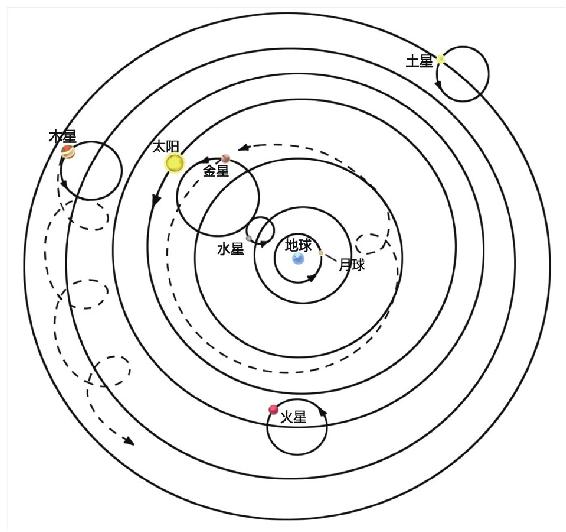 下图展示了地心说的宇宙图像。地球坐镇宇宙的正中心并保持静止,从内向外依次是月球、水星、金星、太阳、火星、木星和土星。月球和太阳都在围绕着地球做圆周运动。而其他五颗行星,它们的运动情况很像是游乐园里的旋转咖啡杯:首先,它们都在一个叫本轮的小圆上旋转;其次,本轮的圆心也在一个叫均轮的大圆上绕地球运动。换言之,五颗行星的运动轨迹是由本轮和均轮这两个圆周运动组合而成的。更外面,则是一个水晶球似的巨大球壳,叫恒星天,其他星星全都镶嵌在这个恒星天的内壁上。托勒密的地心说是一个比较完善的科学理论,可以很好地解释当时的各种天文学现象。因此,它被人们奉为经典,统治了学术界长达1400年之久。