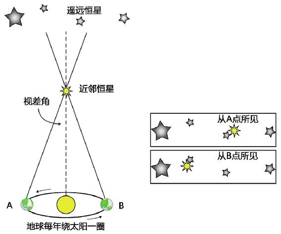 有了视差的概念,我们就可以用几何学的方法来测量遥远天体的距离了。下面这张图就是用三角视差法测量距离的原理图。我们都知道,地球每年会绕太阳一圈。如果地球在春分的时候运动到图中的A点,那么半年以后,也就是秋分的时候,它会到达离A点最远的B点。现在把A点和B点当成是一个人的左眼和右眼,分别从这两个地方来观察一颗离我们不太远的星星,就会发现这颗星星在遥远天幕上的位置发生了变化。从B点看来,相对于在A点,星星的位置会向左移动。这个向左的偏移量可以转化为一个角度,叫作星星的周年视差角。科学家已经测出,地球到太阳的平均距离约为1.5亿公里,相当于地球周长的3750倍。我们通常把这个日地距离称为1个天文单位。用1个天文单位除以星星的周年视差角,就可以算出我们到这颗星星的距离。
