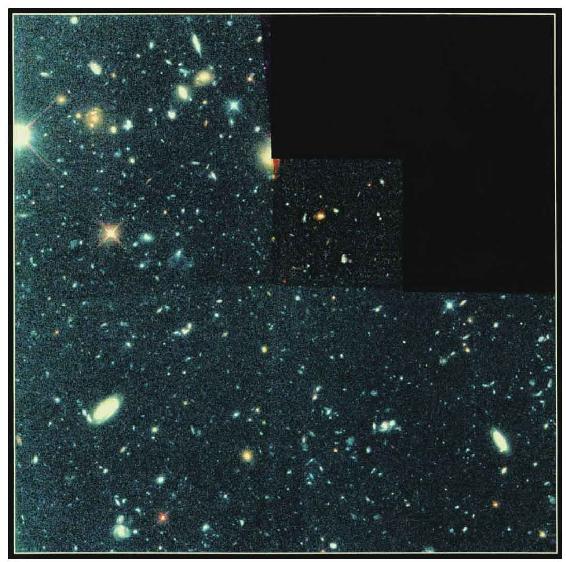 1995年12月18日,天文学家把哈勃空间望远镜指向了大熊星座中一块看似空无一物的区域。这块区域(右图中标记的那块)的范围很小,仅占整个天空总面积的2400万分之一,相当于100米外的一颗网球。为了能拍清楚,科学家对这块区域持续观测了10天,然后把拍到的底片曝光了342次,并将它们叠加,合成了一张照片。