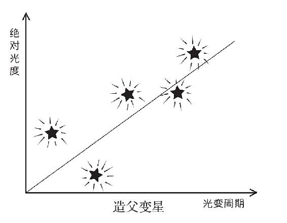 1908年,通过对麦哲伦星云中上千颗变星的详细研究,勒维特发现,造父变星满足一种非常奇妙的规律:在距离相同的情况下,造父变星的可视亮度和它的光变周期成正比。也就是说,一颗造父变星完成一轮完整循环所花的时间越多,它所能达到的最大亮度就越大。这个规律被称为造父变星的周光关系,也叫勒维特定律。它意味着,只要选择那些光变周期完全相同的造父变星,我们就能得到一大批绝对亮度完全相同的天体。这就是历史上发现的第一种标准烛光!这个伟大的发现,让我们能够精确测量那些极其遥远的天体的距离。从那以后,人类就不必在书斋里空想宇宙的样子,而可以用望远镜来直接地观测它。宇宙学也由此成为一门真正意义上的现代科学。