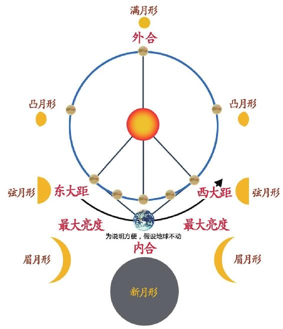 什么是金星盈亏呢?给大家看一张图,你们就明白了。我们都知道,月球是有盈亏的。为什么它会有盈亏呢?因为月球本身不发光,只能反射太阳光。由于月球一直都绕着地球旋转,它既可以跑到地球和太阳中间,也可以跑到地球背后。农历初一的时候,月球会跑到地球和太阳中间,这时月球会把后面射来的太阳光挡住,我们就看不见它,这就是“亏”,也叫新月;而农历十五的时候,月球会跑到地球背后,这时它可以完全地反射太阳光,我们就能看到一轮最圆的明月,这就是“盈”,也叫满月。类似地,如果金星一直处于地球和太阳中间,就会挡住太阳光,形成类似于新月的状态。反过来,如果它能像图中所示的那样跑到太阳背后,就可以完全地反射太阳光,形成类似于满月的状态。