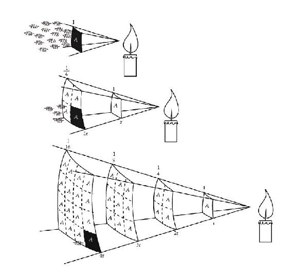我们都有这样的生活经验:一根点燃的蜡烛,要是放在近的地方,看起来就比较亮;要是放在远的地方,看起来就比较暗。这是为什么呢?下图就解释了其中的原理。爱因斯坦告诉我们,光是由一个个被称为光子的微小颗粒组成的。只要蜡烛的绝对亮度是固定的,则它在单位时间内发出的光子总数也是固定的。这些光子会呈球形均匀地向外扩散,随着扩散距离的增大,这个球的面积也会越来越大。因为整个球面上的光子都是由蜡烛发出的,其总数会一直保持不变,所以单位面积上的光子数目会相应减少。换句话说,在远处,我们眼睛能接收到的单位面积的光子数会减少,这也会使光的可视强度变小,所以我们才会觉得蜡烛变暗了。更重要的是,蜡烛的可视亮度与我们和蜡烛距离的平方成反比。比如说,如果距离扩大4倍,蜡烛的可视亮度就会减小到原来的1/16。