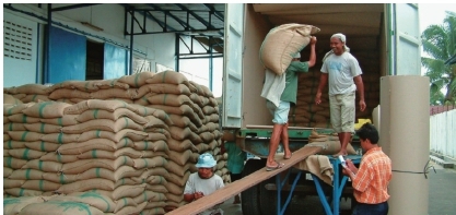 脱壳后的咖啡豆会被装进麻袋或黄麻袋里,放进集装箱后装船。装船完成,出口商收到出口单据,开始安排付款。收款人可能是出口商也可能是合作社,总之,去年4月开始的所有辛苦终于有了经济回报。