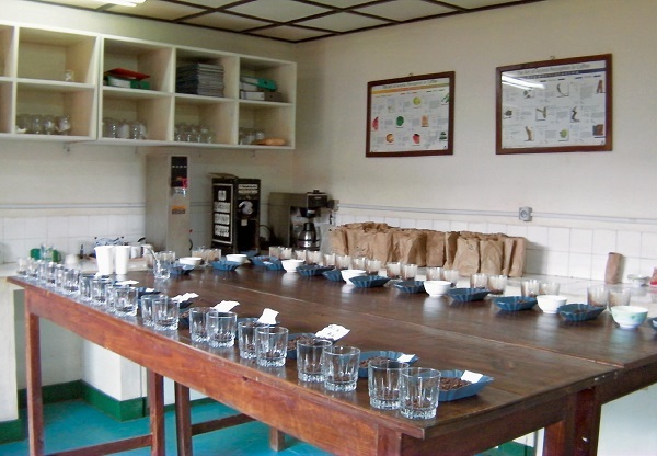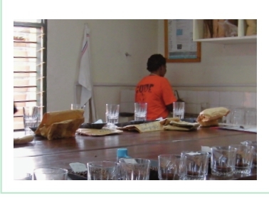 基加利(Kigali)的卢瓦苏斯克小型种植户精品咖啡公司的杯测桌,各种卢旺达咖啡的特点和品质将会在这里接受评判。