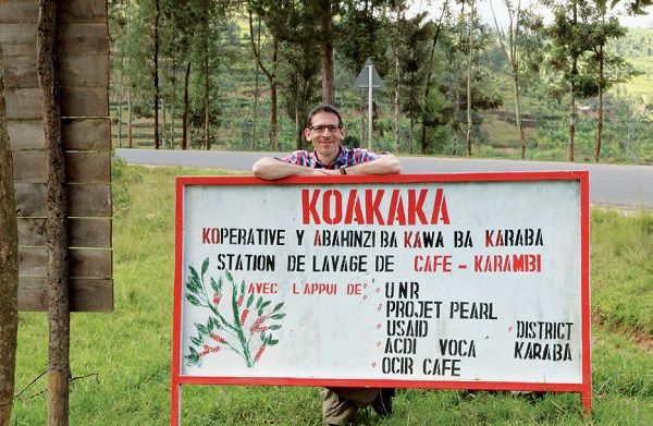 (上右)杰里米站在联盟第3家合作社——卢旺达卡拉巴地区卡卡合作社的入口处。