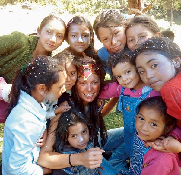 (下左)联盟生产商公关经理帕斯卡莱·舒伊特和危地马拉埃斯基普拉斯合作社里的孩子们在一起——戴着蝴蝶面具的是她。