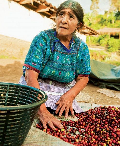 危地马拉韦韦特南戈,埃斯基普拉斯合作社的一名成员正在晾晒咖啡果。