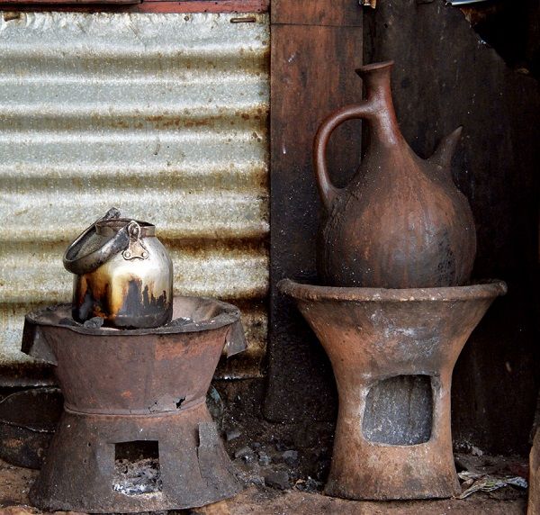 在埃塞俄比亚街边的咖啡摊。黏土制的黑色咖啡壶煮出的咖啡散发着纯粹的香气,喝完再用一杯小壶里煮好的红糖水,美味十足。