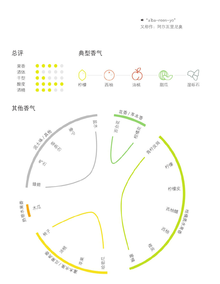 ALBARIÑO原产地:葡萄牙北部下海湾,西班牙 下海湾90%的葡萄园都种植阿尔巴利诺。萨尔内斯峡谷地区是最传统的种植子产区之一。 米尼奥,葡萄牙 葡萄牙绿酒产区把这一品种称为阿尔瓦里尼奥(Alvarinho),以其酿造的白葡萄酒口感脆爽、芳香浓郁,并会轻微喷洒。 阿尔巴利诺里具有甜瓜和西柚的香气,源自一种叫硫醇(Thiols)的芳香化合物。硫醇通常出现在凉爽气候产区出产的轻盈酒体白葡萄酒中,比如新西兰和法国的长相思、意大利北部的灰皮诺。 阿尔巴利诺特别适合搭配泰国菜、摩洛哥菜和印度菜。