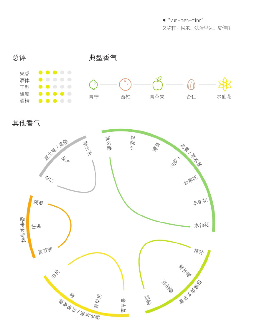 苦味:维蒙蒂诺葡萄酒在余味中常出现类似西柚髓的苦味。这一类型的风味被称为“酚苦”(用来描述白葡萄酒中的苦味,且只要含量适宜,酚苦就能使葡萄酒的陈年时间变得更长),这是很多意大利白葡萄酒中常见的风味,包括维蒂奇诺、格莱切多和圣吉米亚诺维奈西卡。