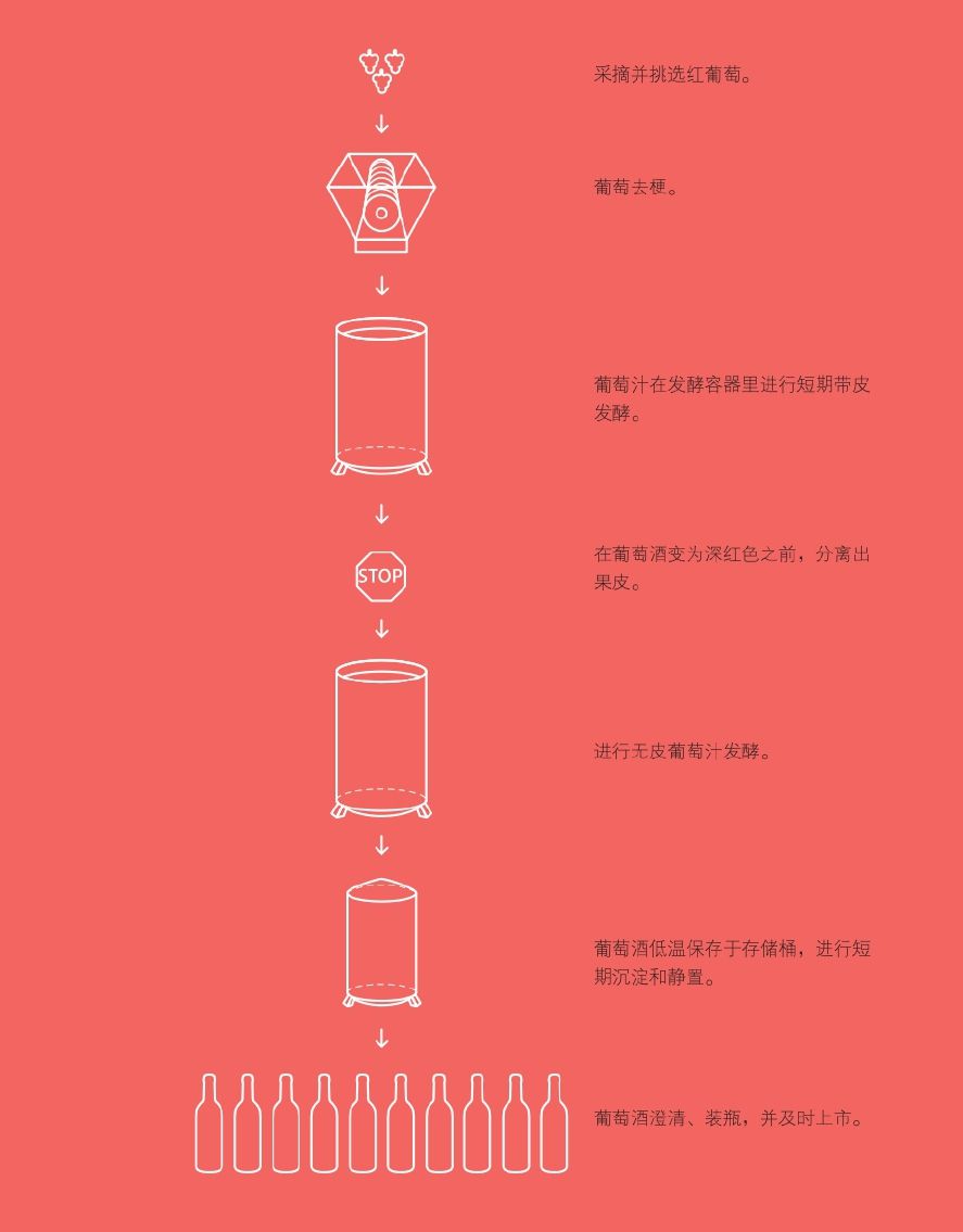 ROSé WINE桃红葡萄酒酿造桃红葡萄酒时,需将红葡萄的果皮浸泡在葡萄汁中一段时间。主要的葡萄酒生产国都出产桃红葡萄酒,并且几乎每种红、白葡萄品种都可用来酿造桃红葡萄酒。其类型从干型到甜型均有,例如,丹魄桃红葡萄酒通常为干型、可口型,而白仙粉黛桃红葡萄酒则多为甜型、果香型。