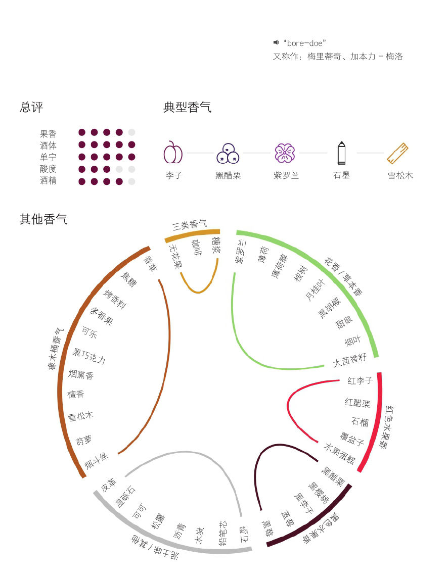 黑樱桃、紫罗兰&月桂叶风味具有酸涩的黑色水果、红色水果风味,并伴有紫罗兰、黑胡椒和月桂叶的味道。由于酸度较高,此类酒喝起来更轻盈。