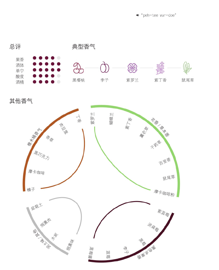 味而多因其深紫色颜色、高单宁和花香而被广泛用于混酿,特别是波尔多混酿。