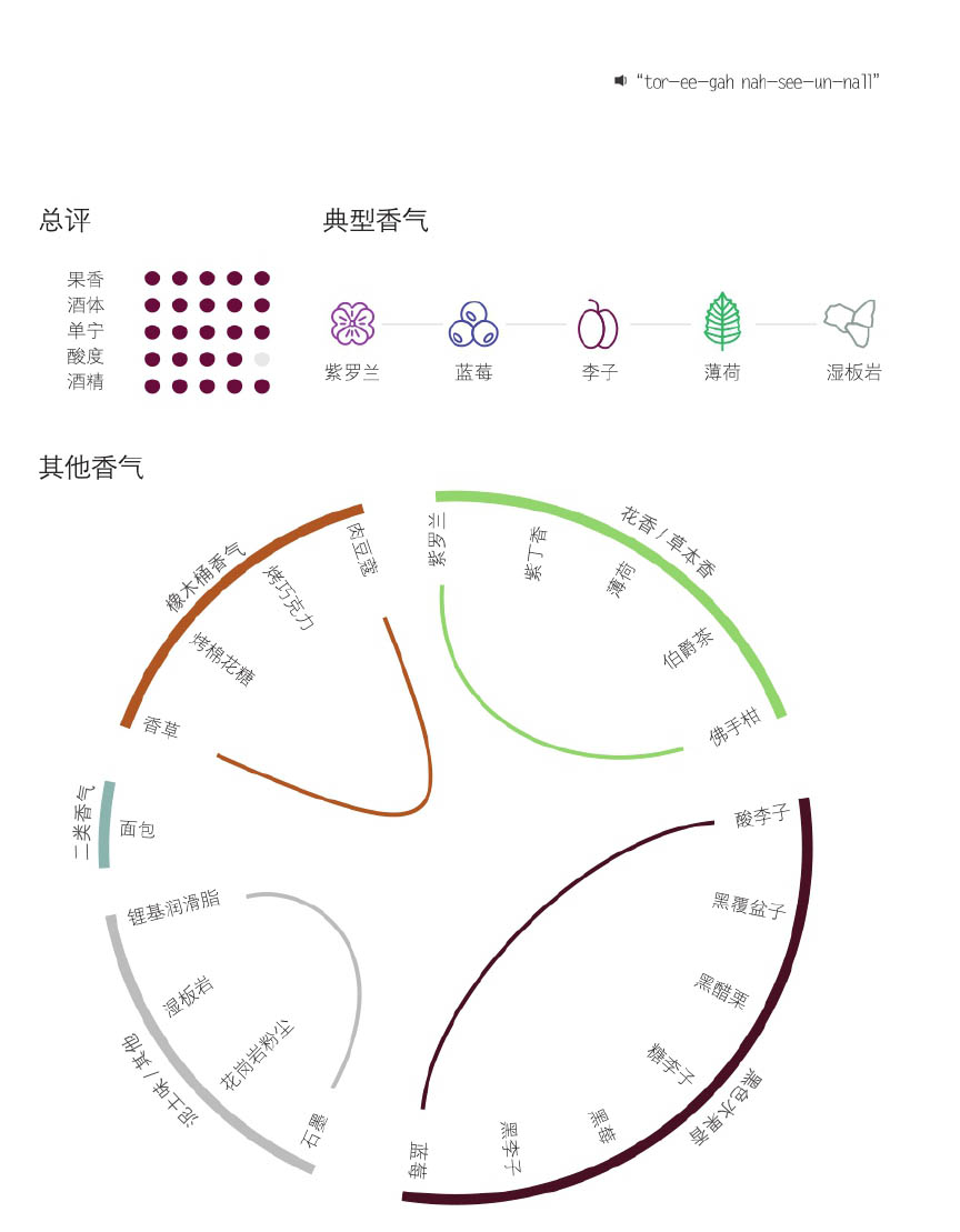 具有蓝莓、黑醋栗、紫罗兰、香草风味和轻微的烤肉味,单宁结构粗糙。