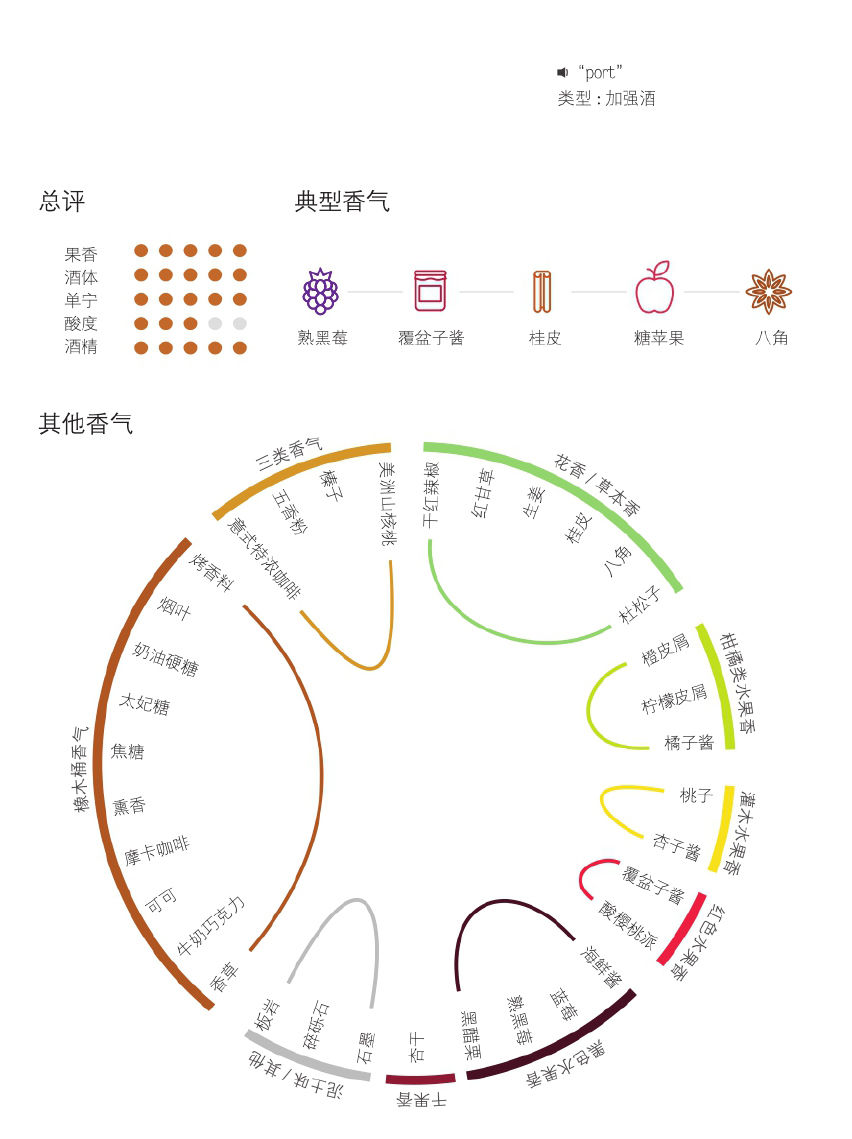 具有覆盆子、蓝莓干、桂皮、丁香和焦糖的风味。