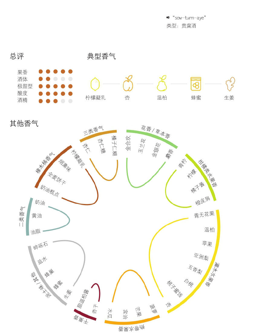 主要产区:苏玳,其名来自波尔多一个出产甜酒的地区,该地区靠近河流,所种植的葡萄易感染贵腐菌。