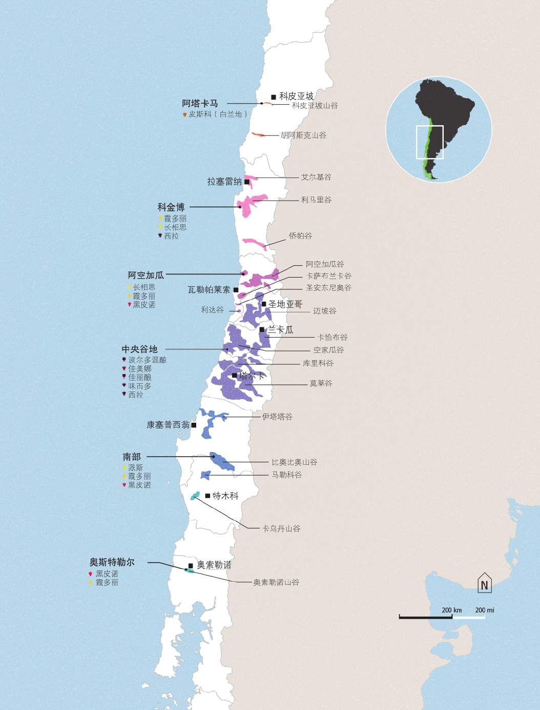 智利位于凉爽气候地区,以出产清瘦的果香型波尔多混酿而闻名。从海岸到安第斯山脉,智利被分为3个区域。