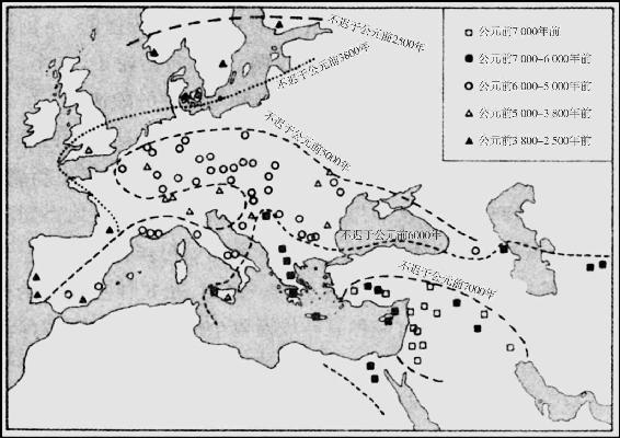 图10.2 图中符号表明发现新月沃地作物残骸的用碳-14测定法测定的早期地点。□= 新月沃地本身(公元前7000年前的地点)。注意:离新月沃地渐远,则年代亦渐晚。本图据左哈利和霍普夫的《旧大陆植物驯化图20》绘制,但以经过校正的碳-14测定法测定的年代代替其未经校正的年代。
