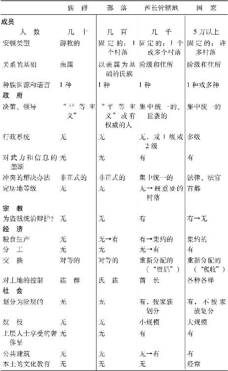 国家的所有这些特征,把从部落到酋长管辖地的发展引向了极端。不过,除此以外,国家还是从酋长管辖地沿几个不同方向演化的结果。这方面最根本的差别是,国家是按政治和领土而组建起来,不是按照划分族群、部落和简单的酋长管辖地的亲属关系而组建起来的。而且,族群和部落始终是由单一的族群和语族组成的,酋长管辖地通常也是如此。然而,国家——尤其是通过对一些国家的合并或征服而形成的帝国——通常都是包括不同种族和使用多种语言的。在后期的国家中,包括今天大多数国家在内,领导常常变成非世袭的,而且许多国家放弃了酋长管辖地遗留下来的关于正式世袭阶级的整个制度。