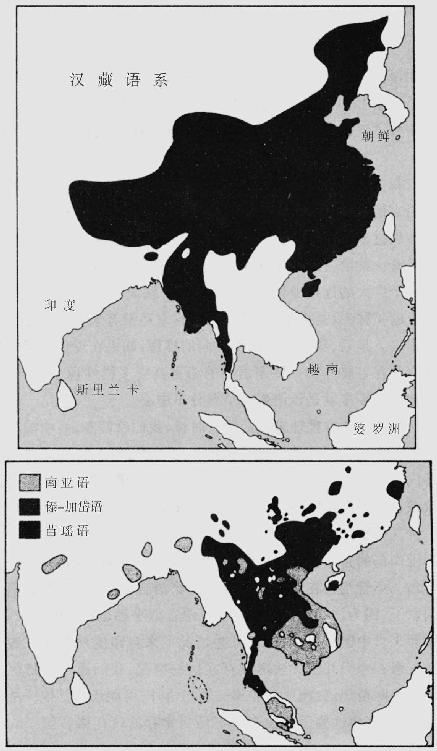 官话及其亲属语言,它们构成了汉藏语系中的汉语族,连续分布在中国的华北和华南。人们可以从中国东北徒步穿行整个中国到达南面的东京湾[1],而仍然没有走出说官话及其亲属语言的人们所居住的土地。其他3个语族的分布零碎分散,为一些“聚居区”的人们所使用,被说汉语和其他亲属语言的人的“汪洋大海”所包围。