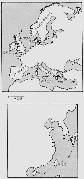 中国海岸线与欧洲海岸线的比较,按相同比例绘制。请注意:欧洲的海岸线曲折得多,并且包括更多的大半岛和两个大海岛。