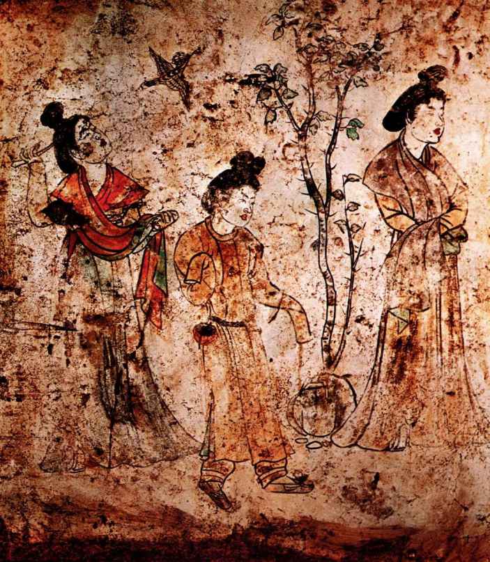 1971年出土于陕西乾县唐章怀太子李贤墓。李贤是高宗与武则天的次子。画面中树下三宫女神态各异,动作自然,富于变化:树木右侧的宫女双手叉于身前,若有所思;中间一人全神贯注,右手甩袖,欲捕捉树干上的蝉;左侧一人左手托帔帛,右手簪发,仰头观鸟。