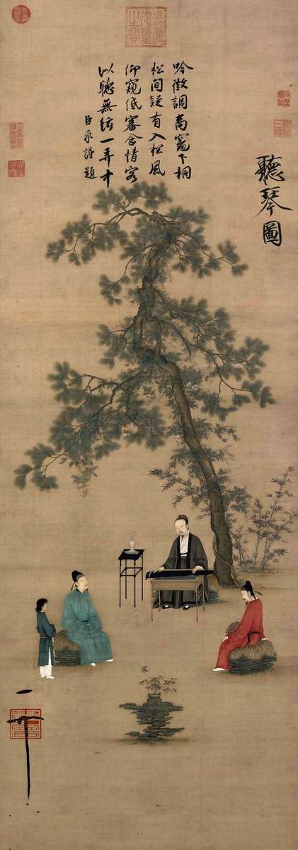 此图是宋徽宗人物画的代表作。画面上方有蔡京的题诗:“吟徵调高灶下桐,松间疑有入松风。仰窥低审含情客,以听无弦一弄中。”画中人物身处一高雅庭院中,环境简洁而幽静。图中弹琴之人是宋徽宗赵佶,听者三人神态各异,似乎沉浸在这静谧的气氛中。