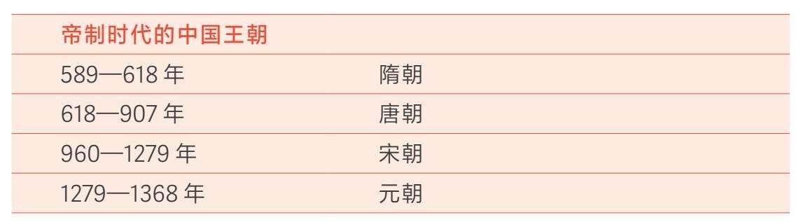 如果我们把6世纪末到14世纪中期的中国王朝也像古埃及王朝那样编上序号的话,隋和唐就是第二帝国,宋是第三帝国,元是第四帝国。然而,数字无法传达出这些王朝的特征。唐朝(618—907年)是所有人最喜爱的朝代:开放,四海一家,开疆拓土,生气蓬勃,富于创造性。唐代中国作为榜样,对日本、朝鲜和越南的国家建构与文化繁荣具有决定性的影响。诗歌艺术在唐代达到巅峰,后无来者。宋朝(960—1279年)在艺术上与唐朝旗鼓相当,是中国绘画的杰出时代,也是中国哲学自周代诞生以来最为重要的时期。尽管军事实力不强,宋朝仍然出现了重要的商业革命。元朝(1279—1368年)是蒙古人治下的短命王朝,当时的中国是迄今为止世界上最大的帝国。