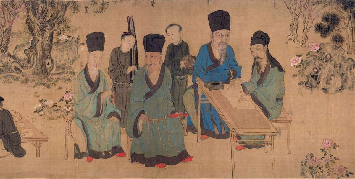 北宋王安石变法期间,大臣富弼与其政见相左,称病辞官,退居故乡洛阳。他和司马光等十三人,置酒赋诗相乐,时人羡艳,谓之“洛阳耆英会”。图中主要人物右起分别为司马光、富弼、赵丙、张焘,或围案赋诗,或相顾唱和,形象生动。