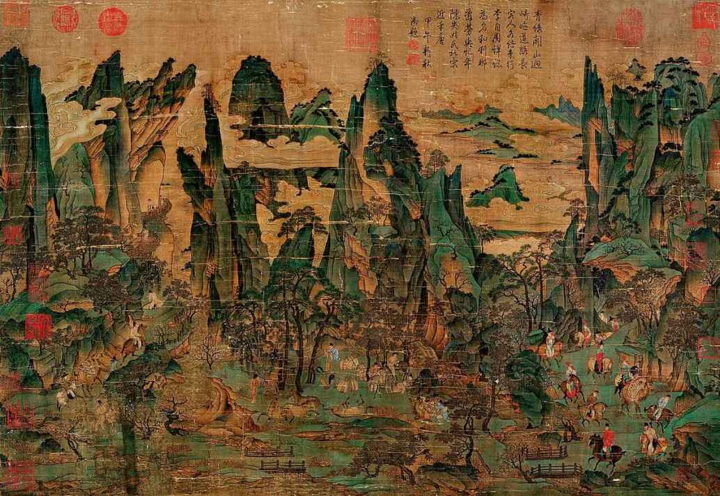 此图描绘的是唐玄宗李隆基为避安史之乱,远走蜀地的情景。图中山势突兀险峻,云雾缭绕其间,让人不禁生出“蜀道之难,难于上青天”之感。崇山峻岭之间,一行人马在艰难行进。身穿红衣的唐明皇骑着三花马正待过桥,嫔妃身着胡装、头戴帷帽,随行的还有大臣、侍从和马匹等。