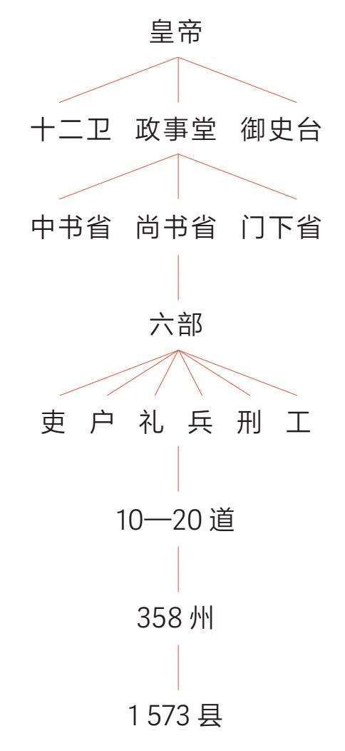 中央集权的程度从官僚体系的正式组织上显而易见。最高一级是三个机构:十二卫、御史台、政事堂。十二卫遥领全国军队,皇帝本人是实际上的最高统帅。御史台是监察机关,直接向皇帝汇报弹劾官吏的违法行为,并且在认为皇帝自身行为失当时加以劝谏。政事堂是最重要的机构,每天朝见皇帝,由中书省、门下省和尚书省长官组成。其中,中书省负责起草诏令,门下省负责审查中书省起草的诏令,尚书省负责执行颁布的诏令。尚书省下设六部,六部直到20世纪初都是中央政府的核心机构;六部之下是不同层级的地方政府机构。