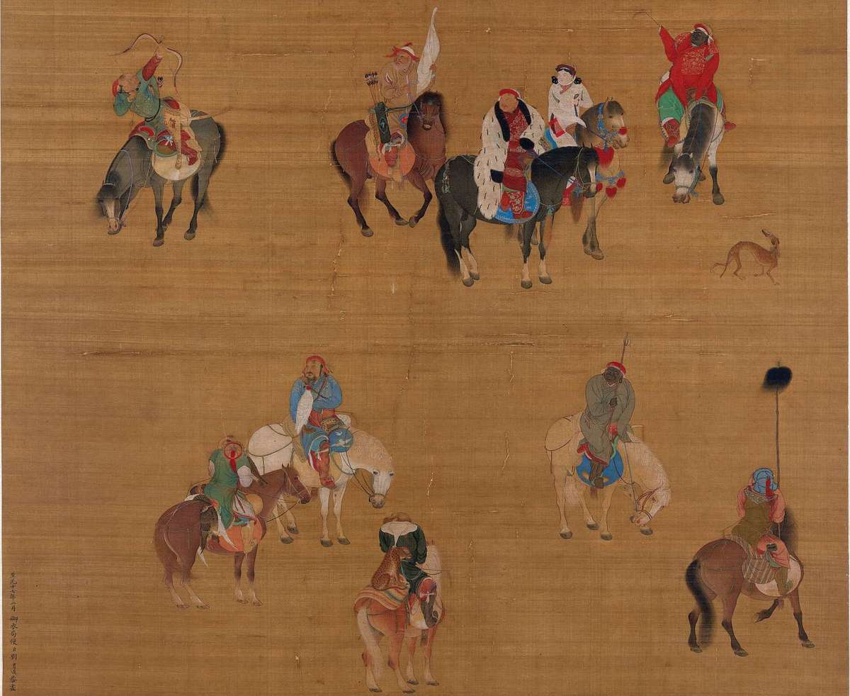 此图描绘的是元世祖于秋凉时节率领随从在旷野狩猎的情景。画面中黄沙浩瀚,朔漠无垠,世祖忽必烈身穿红衣,脚蹬红靴,外批滚黑边的白色毛裘,勒马回望。
