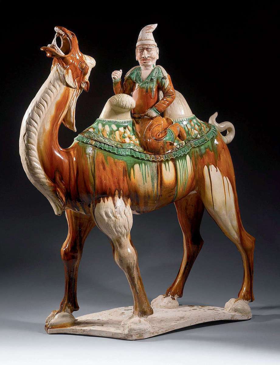 在丝绸之路上,骆驼是主要的交通工具,其造型在唐三彩中很常见。骆驼上的人俑,深目、高鼻、大胡子,是典型的胡人相貌。此俑真实而形象地反映了唐代丝绸之路和中外文化交流的繁盛景象。
