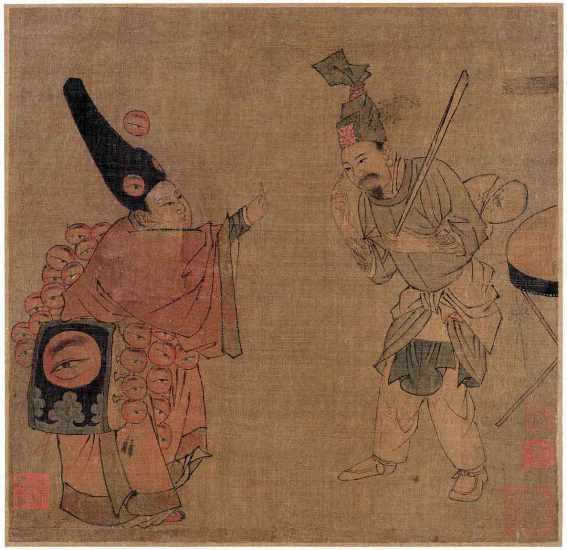 此图表现的是当时杂剧演出的真实场面。启功先生认为应当是元人画。画面中一老者手指眼睛,表明是买药的患者。另一位头戴高帽、身上挂满眼药膏的少年,当是卖药人。卖药人的药袋、药膏上都画满了眼睛,富有舞台气息。旁边放置一鼓,表明当时杂剧是边击鼓边表演。