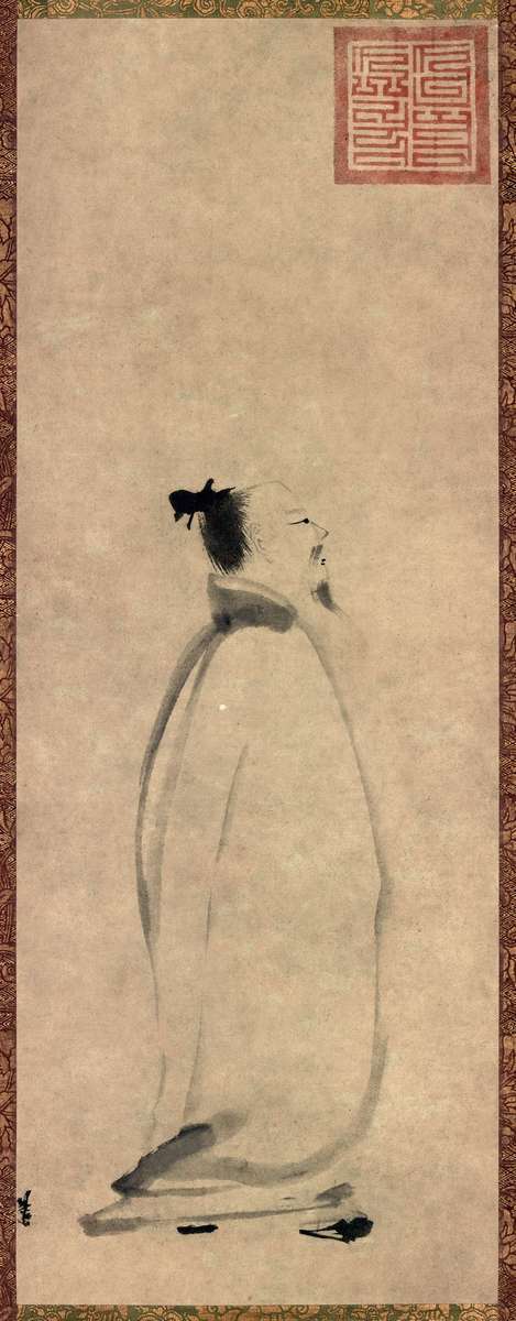 藏于东京国立博物馆。梁楷性格狂放,嗜酒自乐,擅长画释道人物和山水,发展了水墨减笔画,用笔精炼纯熟。《太白行吟图》是他减笔画的代表作品。此图寥寥数笔,就把“诗仙”李白飘逸的风度和神韵勾画得惟妙惟肖。