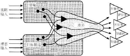 这可能看上去既简单又复杂。一方面,从心理学角度来说,要表现人类在追求目标的过程中产生的雄心、挫折、满意和失望,差异发动机可能看上去太原始。但那些心理过程并不是构成目标的要素,而是那些参与追求目标的智能组之间相互作用的产物。另一方面,人们可能会想,一个目标的概念用得着牵扯到智能体、情境、描述、差异这么复杂的四向关系吗?不久我们将会看到,这实际上比看上去简单一些,因为许多智能体已经开始关注差异了。