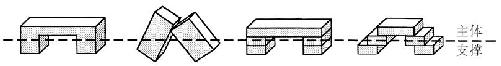 现在,忽然之间,所有这些不同的拱门都符合了单一的框架,即一个主体和两个支撑。这里有两个不同的理念。第一个理念是把一个客体分割为两个部分,一个是“本质”部分,也就是“主体”,另外还有辅助的部分,与支撑相对应。之后我们会看到这个理念本身就很强大。第二个理念更强大也更普遍:在无法为所有这些拱门找到统一的描述时,我们放弃了之前所使用的方法,而采用了一种非常不同的描述方式。简而言之,我们从新的角度重新构想了问题。开始时我们使用一种以表达单个积木精确形状为基础的语言。之后我们换成了另一种语言,在这种语言中,我们所说的形状和轮廓并不受限于积木本身的形状和轮廓。