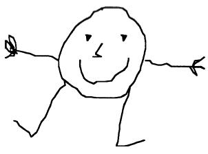 当孩子开始画的时候,列表上的第一项是“大的封闭图形”。因为还没有这个东西,孩子画了一个:那就是头。接下来画好眼睛和嘴。但到了要画身体的时候,程序的步骤2发现“大的封闭图形”已经画好了。于是,没有新的内容需要画,程序直接前进到了步骤3。结果孩子继续把胳膊和腿连接在了指定给身体和头的那个图形上。