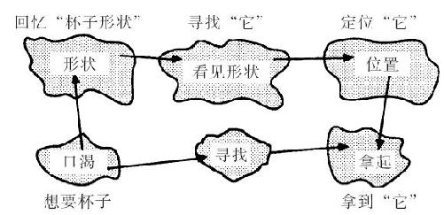 假设“口渴”知道可以在杯子里找到水,但不知道怎么找到或者拿到杯子,这些事只有“寻找”和“拿起”知道该怎么做。于是,“口渴”必须有某种可以利用其他那些智能体的能力。同样,“建设者”也有相似的问题,因为它手下的大部分次级智能体之间都不能直接沟通。开启“寻找”和“拿起”对“口渴”或“建设者”来说是很容易的事,但这些次级智能体怎么能知道要找什么和拿什么呢?“口渴”一定要向“寻找”传送一张杯子的图片吗?“建设者”一定要传送砖块的图片吗?麻烦之处在于“建设者”和“口渴”都没有“寻找”所需要的那种信息,也就是事物的外观样式,这类知识存在于“看见”的内部记忆机器里。然而“口渴”可以通过激活两个联结而实现喝水的目标:一个联结是让“看见”幻想一个杯子,另一个联结是激活“寻找”。“寻找”之后又可以激活“拿起”。如果这个杯子在视线范围内的话,这就足以让“口渴”定位并得到杯子了。