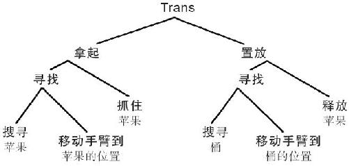 初看之下,好像所有这些智能体都与苹果和桶有关。但仔细看一看你会发现,只有低水平的智能体“搜寻”和“抓住”真正与实际对象的物理属性相关;其他智能体仅仅是“中间水平的管理者”而已。举例而言,“拿起”并不会真的拿起任何东西;它只是在适当的时候开启了“寻找”和“抓住”而已。当然,“搜寻”会需要一些关于要找什么的信息,也就是关于苹果外表的信息,而“移动”会需要关于苹果实际位置的信息。然而,我们会看到,这些智能体可以获得想要的信息,但不需要从“拿起”那里获得。想知道智能体们是如何不用外显信息进行操作的,让我们比较一下对如何把苹果放进桶里的两种普通语言描述。第一种脚本中,在每一行都明显地提到了操作的对象,我们对新手说话时可能就是这个样子。