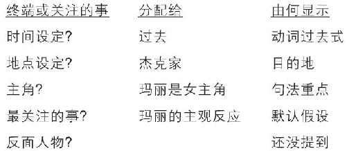 许多故事的开头都会设定一个场景。然后它们会介绍一些人物,并且会暗示一下这些人物主要关注的事。接下来,讲故事的人会提供一些关于“主要事件”或待解决的问题的线索。从这时起,听众就会对接下来将发生什么有了一般的理念:问题会有进一步的发展,然后会通过某种方式得以解决,然后故事结束,可能还会给出一些实用建议或道德建议。无论如何,这些故事开头的词语了解听众的思维,可以唤醒大量的预期-框架,帮助听众提前知道要填充哪些终端。
