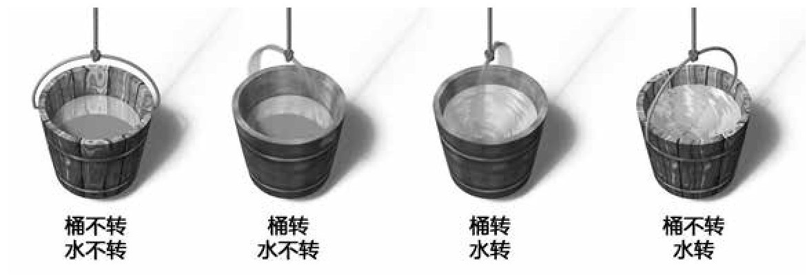 有一个大水桶,里面装半桶水,在水桶里有个观察者,他完全看不到外界的景象。那么外界吊起这个水桶,带动水桶旋转,水桶内的观察者跟着水桶一起旋转。一开始,因为惯性,水是静止的,水桶在转。观察者会发现,水面是平的,桶和水有相对旋转,慢慢地,水被桶带动了。因此桶内的观察者会发现,水跟桶在同步旋转,并没有相对速度,但是水面凹下去了。这时候,外界刹车,桶停止转动了,水相因为惯性的缘故,不能马上跟着停下来。那么此时桶内观察者发现,水和桶有相对旋转,但是水面是凹的。慢慢地水面因为摩擦,也停下来了,水面又变成了平面。