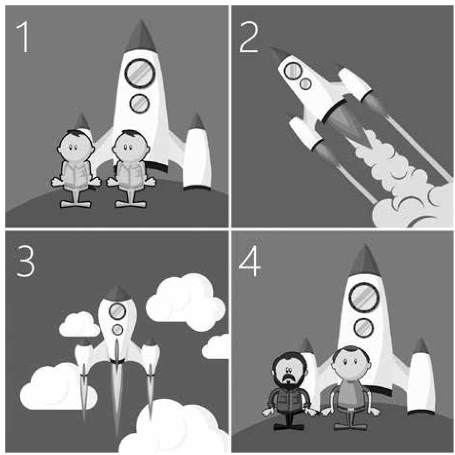 后来,法国的一位物理学大牛发话了,这一位就是朗之万(图8-1),他是大名鼎鼎的居里先生的学生。在1911年发表的一篇题为“空间和时间的演进”的文章中,朗之万为了描述得更加人性化一点,不采用钟表来描述时间,而是用了人的年龄。爱因斯坦总是喜欢描述:“对方路过你的时候,你瞥一眼看看对方的钟”,这哪里能看得清楚啊?朗之万觉得这事不好办,需要一个能够累计时间误差的玩意儿,于是他想到了人的年龄。后来为了表述对比更加明确,又给描述成了双胞胎比较年龄的问题,于是“时钟佯谬”就变成“双生子佯谬”(图片8-2)了。