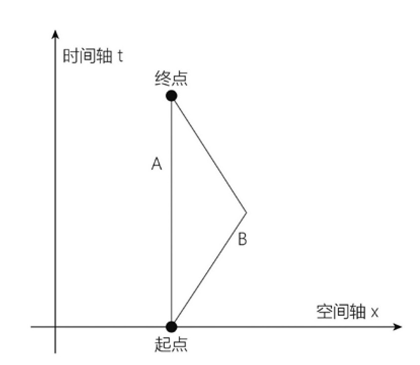 A蹲在地上不动,但是时间滚滚向前不能停止,因此他在时间轴上还是在运动的。A在图上拉出了一条垂直线,B沿着X轴向前飞行,在空间轴上有运动,同样时间轴上也有运动,因此在图上显示的是一条斜线。他们起点是一致的,从同一个地方出发,终点也是一致的,因为他们再次见面了,必定时间和空间都一致才能见到。B在中间做了一次大转弯,调头向回飞行,因此在时空图中,B的路径是一条折线。我们现在看出来了,原来A与B在四维时空中走过的路径是不同的。根据闵可夫斯基的理论,我们现在画出的时间轴叫做“坐标时”,并非是每个人自己感觉到的时间。每个人自己拿着钟测量出来的时间叫做“固有时”,固有时才是两个人自己的时间。四维时空中的线的长度,就是两个人真实的年龄,因此我们已经可以清晰地看到,两个人在时空图中走过的路径不同,因此路径长度也不一样。
