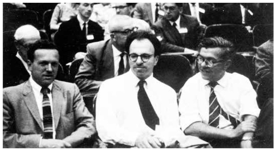 受这个思想的启发,1948年,霍伊尔、古尔德和邦迪(图13-8)几个人就鼓捣出来一个“稳恒态宇宙模型”,主要想法就是避免宇宙的开端。如果你要是承认宇宙是有诞生的那一刻的,在宇宙诞生之前又是什么呢?伽莫夫他们没法回答这些问题,最起码物理学规律就不再是“普世价值”了。诞生之前,物理规律不起作用,宇宙之外,物理规律不起作用,霍伊尔无论如何不能接受这样的结论。可是你不接受又能怎样呢?你怎么解释哈勃红移呢?宇宙的确是在不断地膨胀的呀。霍伊尔他们总结出来的理论是这样的:尽管天体都在逐渐远离,但是会有天体从宇宙混沌中生长出来,填补空白。那么宇宙总体看起来还是跟原来差不多,就像一条河流,每个水分子都在不断地流动,但是整条河看起来却没什么变化。