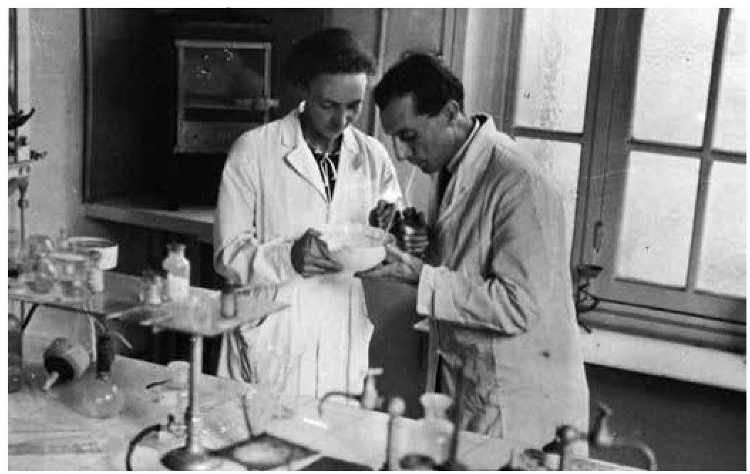 1932年,《自然》杂志上刊登了一篇文章,叫做《中子可能存在》,作者是查德威克。远在法国的约里奥-居里夫妇(图13-1)两口子看到这篇文章,估计会懊恼不已,因为查德威克做的实验,就是他俩以前做过的“石蜡实验”的翻版:用“铍射线”照射石蜡,会从中敲出质子。他俩觉得这是稀松平常的事情,不值得注意,白白放过了一个重要成就。居里家族是个声名显赫的家族,老一代皮埃尔·居里和玛丽·居里是科学界的有名的夫妻诺贝尔奖获得者,他们的女儿依琳和约里奥结婚以后,把两家的姓氏合在一起,姓“约里奥-居里”。居里家族都是实验物理学家,做实验的本事堪称一绝,经常一不留神就触动其他科学家做出重大贡献。