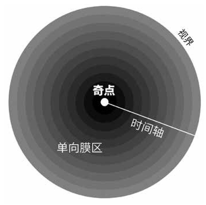 在史瓦西黑洞(图15-3)里,时空已然倒置了。我们在正常的时空里面,你压根看不见时间轴,但是在黑洞里面,观察者A到奇点的连线,就是时间轴。时间不停流逝永不回头,空间变成了一层层的膜,组成洋葱一样的结构,我们称之为“单向膜区”。既然如此,你就无可避免地向奇点飞过去,逐渐被拉成面条。因为奇点附近时空起伏,可能在拉成面条的过程中还扭了几扭,最后,你已经变成了扭曲时空的一部分,为黑洞贡献了一份质量。或许,你应该盼望着物理法则失效,可能还有生路?也许吧!反正外部观察者B是再也不会见到你了,开个追悼会还是有必要的,你将永远活在我们心中。
