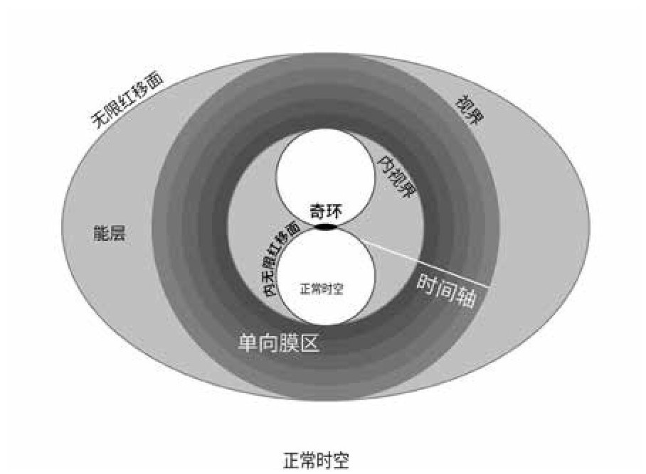 如果你没有及时扔出个碎块,那么你肯定会掉进克尔黑洞的视界里,然后一如既往进入单向膜区。反正钻黑洞,你也不是一回两回了,单向膜区也已经是轻车熟路,不被拉成面条就是万幸,至于拉成兰州风格的还是意大利风格的,要看黑洞内部的稳定性。穿过单向膜区,通过内视界面、内无限红移面,一直到了奇环跟前。这里面是正常的闵可夫斯基时空,人可以存活,你发现这个奇环很有趣,迫不及待想钻过去试试。结果发现,就像机器猫的任意门一样,正面进去,并没有从背面出来,而是被传送到了另一个宇宙,这个宇宙是以斥力为特征的非常奇怪的宇宙。当然了,黑洞内部的空间拓扑结构是非常混乱的,你千万别指望着能在里面看到这一切稳定地存在下去,见到奇环还是千万别乱钻,万一不稳定,通道被掐死,你就危险了。物理学家们的词儿听起来学术味十足,称作“法矢量倒在表面上”,说白了就是你回不来了。